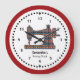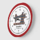 This sewing themed wall clock is printed with a patterned sewing machine image pieced and stitched with faux fabric simulating woven plaid tapestry in dark reds,blues and yellows. Easy to see numbers on a crisp clean black and white face. Personalise the text in the easy Zazzle editor for your favourite sewing or quilting enthusiast. Change the outer background colour if desired. Great wall decor gift in your choice of round or square styles.