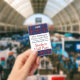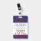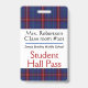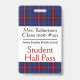 School teacher's student hall pass badge done in white with a red, white, blue and black plaid pattern, across the top and bottom. Personalise the text fields to read what you want.