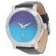 A very plain big faced watch with varigated blue face, Red Numerals. Classic in style,this watch will never date.Three hand quartz movement ,and genuine leather strap.