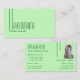 Make a lasting impression with this classic and simple business card design with fine decor stripes and (employees-) photo on a plain pastel sage green background.