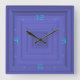 A plain purple wall clock in a background design of squares. This colourful clock has aqua/ green numerals.