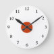 A plain round white kitchen clock. A circular small centre of red with black numbers and hands makes this a popular choice for the kitchen.