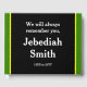 This simple funeral or memorial guestbook features the message "We will always remember you,", and the custom name and birth/death dates of the individual who has passed on. It could be used to record fond memories of somebody who has recently passed away.