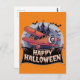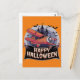 Plane flying over happy halloween banner postcard