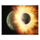 This astronomy illustration is an artist's concept of how it might look if a celestial body of about the size of the moon collides with a planet the size of Mercury. Such a collision would emit a large flash of bright light, and rocky matter ejected into space. This space art image is from the Spitzer Space Telescope mission, and astronomers suggest that the Earth's moon was formed in this way.