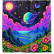 This artsy shower curtain has a pretty planet scene on it.
