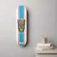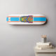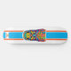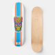 Skateboard with colourful Polynesian Tiki head design over blue and orange racing stripes.