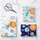 Wrapping paper with a First Trip Around The Sun theme for a 1st birthday party. These coordinate with the other outer space themed decor for celestial galaxy parties. These sheets have a blue planets and sun theme with assorted colours backgrounds. There are additional background colours available in this collection.