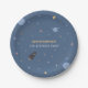 A space themed birthday Paper Plate with planets, stars and a rocket in cartoon style on a blue background. Texts are customisable, so it could be used for any party or dinner, but it will be perfect for a kid's birthday party!