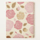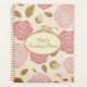 This planner notebook is shown with blush pink looking coloured roses floral print on a ivory background and brown leaves. Personalised name for you to customise to yours inside an ivory oval with dual coordinating coloured borders of golden and pink on the front. Back same colour and rose floral print. Text is in golden. Select your binder spiral on the side, this one is shown with gold.