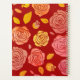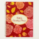 This planner notebook is shown with a peach and blush pink looking coloured rose floral and marigold leaf print on a spicy red background. Personalised name for you to customise to yours inside an ivory oval with dual coordinating coloured borders of marigold and blush-coral-pink on the front. Back same colour and rose floral print. Text is in spicy red. Select your binder spiral on the side, this one is shown with gold.