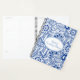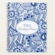 This planner notebook is shown with blue and white floral printed on front and back. Personalised name for you to customise to yours inside an white oval with dual coordinating coloured borders of cornflower blue and periwinkle on the front. Back same colour and rose floral print. Text is in cornflower blue. Select your binder spiral on the side, this one is shown with black.