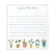 This personalised writing pad features a cute potted plant botanical garden illustration border on the bottom in shades of blue, green and coral pink.