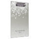 Chic black clipboard features two lines of custom text in classic black lettering, on a silvery grey background adorned with a burst of white bokeh lights at the top. Design repeats on reverse side.