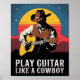 "Play Guitar Like a Cowboy" poster by Not My First Rodeo Prints. Immerse yourself in the Wild West with this vibrant artwork featuring a cowboy strumming his guitar against a stunning sunset backdrop. The retro colour palette and classic Western vibe evoke a sense of freedom and adventure. Perfect for those who live for country music and rustic charm, this piece adds a bold touch to any space. Let the spirit of the frontier inspire your decor and bring a slice of Americana into your life.