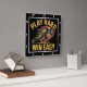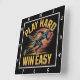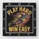 This black wall clock features the text "PLAY HARD" in a bold yellow font arched at the top and "WIN EASY" in a bold red font arched at the bottom. In the centre is a dynamic graphic of a runner, who appears to be a light-skinned individual, in full stride with yellow and red speed lines suggesting motion. The design is motivational and sports-orientated.