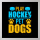 Hockey player poster great for male and female hockey players, features hockey pucks, a hockey stick, dog paw prints, and text reads Play Hockey Pet Dogs!