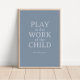 A poster featuring the quote of Maria Montessori, "Play is the Work of the Child" in shades of blue.