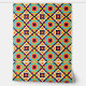 The background is a striking orange hue, which adds warmth and energy to the overall composition. At the points where the diamonds connect, smaller blue squares punctuate the design, creating a dynamic contrast. The colour palette includes orange, yellow, blue, pink, black, and white, resulting in a lively and modern aesthetic.