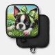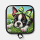 Playful Boston Terrier Puppy with Green Bow Pot Holder
