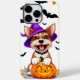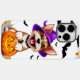 Playful cartoon-style dog with a happy expression, wearing a purple witch's hat. The dog is sitting in front of a carved pumpkin that has a cheerful, smiling face. Surrounding the dog are colourful candy corn pieces scattered across the ground, and several bats flying in the background add to the Halloween theme