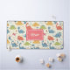 This personalised playful kids' desk mat features colourful, whimsical dinosaurs smiling in fun poses. A hand-drawn name label is in the centre of the design.