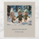 Three cute and realistic winter elves wearing holiday apparel and running in the snow.