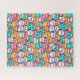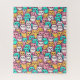 Puzzle in playful, cartoon-style cats in pastel hues of pink, yellow, white, and teal. The cats have a minimalist design with wide eyes and, expressive faces, arranged closely together in a seamless pattern.
