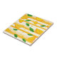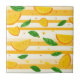 This vibrant seamless pattern ceramic tile features stylised orange slices and fresh green leaves set against bold alternating white and yellow horizontal stripes. Scattered orange and yellow dots add a fun, playful touch, making the design feel sunny, cheerful, and full of zest. Perfect for summer themes, tropical vibes, and fruity, energetic aesthetics.
