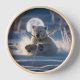 playful polar bear cub rolls in the snow, with a large, luminous moon in the background. The young polar bear enjoys a snowy landscape, kicking up a cloud of snow with its paws.