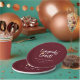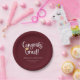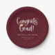 Congrats Grad! Playful white script with golden graduation cap accent, graduation party paper plates. Features, burgundy red colour background.