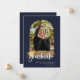 Playful white script with golden graduation cap accent, arch frame 2 photo graduation announcement/invitation. Features, navy blue colour background.