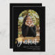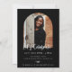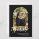 Playful white script with golden graduation cap accent, arch frame 2 photo graduation announcement/invitation. Features, black colour background.