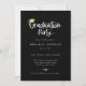 Playful white script with golden graduation cap accent, graduation party invitation. Features, black colour background and single photo on back.