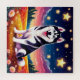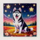 Vivid colourful artwork depicting a happy Siberian Husky under a magical, starlit evening sky amidst blooming flowers in a serene meadow, showcasing a whimsical harmony of nature and playfulness.