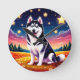Vivid colourful artwork depicting a happy Siberian Husky under a magical, starlit evening sky amidst blooming flowers in a serene meadow, showcasing a whimsical harmony of nature and playfulness.