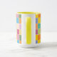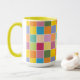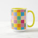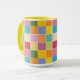Colourful chequered coffee mug designed with various shades of yellows, orange, greens, lavender and blue.