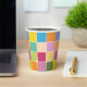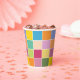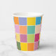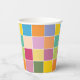 Colourful chequered paper cups designed with various shades of yellows, orange, greens, lavender and blue.
