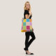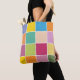 Colourful chequered tote bag designed with various shades of yellows, orange, greens, lavender and blue.