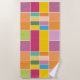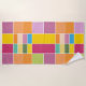 Colourful geometric blocks beach towel designed with various shades of yellows, orange, greens, lavender and blue.