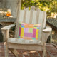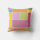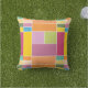 Colourful geometric blocks throw pillow designed with various shades of yellows, orange, greens, lavender and blue.