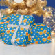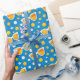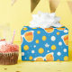 A playful repeating pattern of white sunglasses with orange lenses, set against a vibrant blue background adorned with white and orange polka dots and tiny white flowers.