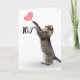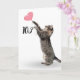 Grey tabby cat with pink heart balloon for 103rd birthday on white background.