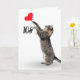 Gray tabby cat with red heart balloon for 108th birthday on white background.