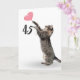 Grey tabby cat with pink heart balloon for 45th birthday on white background.