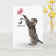 Grey tabby cat with pink heart balloon for 5th birthday on white background.
