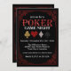 This elegant custom invitation features a poker party theme with a playing card design over a black background. The border features an ornate red frame that resembles a classic playing card. The suits are printed in a glamourous glitter pattern with the gold clubs, red hearts, silver diamonds, and black spades. It's perfect for a poker tournament or game night.