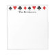 Playing Card Score Pad on a note pad that can be personalized with a name or monogrammed, with vintage suits of a spade, heart, club and diamond for card games like bridge, spades, gin rummy, cribbage, canasta, hearts, pinochle, etc.