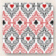Playing card suits inside intricate scroll work designs all on a white background. Be sure to check out the matching throw pillows!