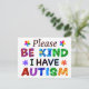 The messages of “Please Be Kind I Have AUTISM” to show autistic pride and raise awareness of autistic spectrum disorders and encourage kindness towards them.